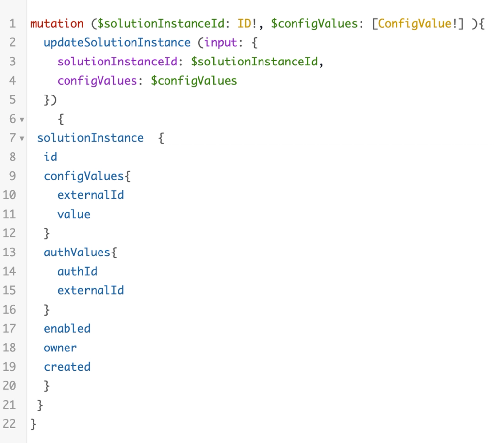 Finally, you will need to set the query to be the above mutation. The output of this connector will be an access token that we will use in a later step to be authorized to perform an update to the solution instance.