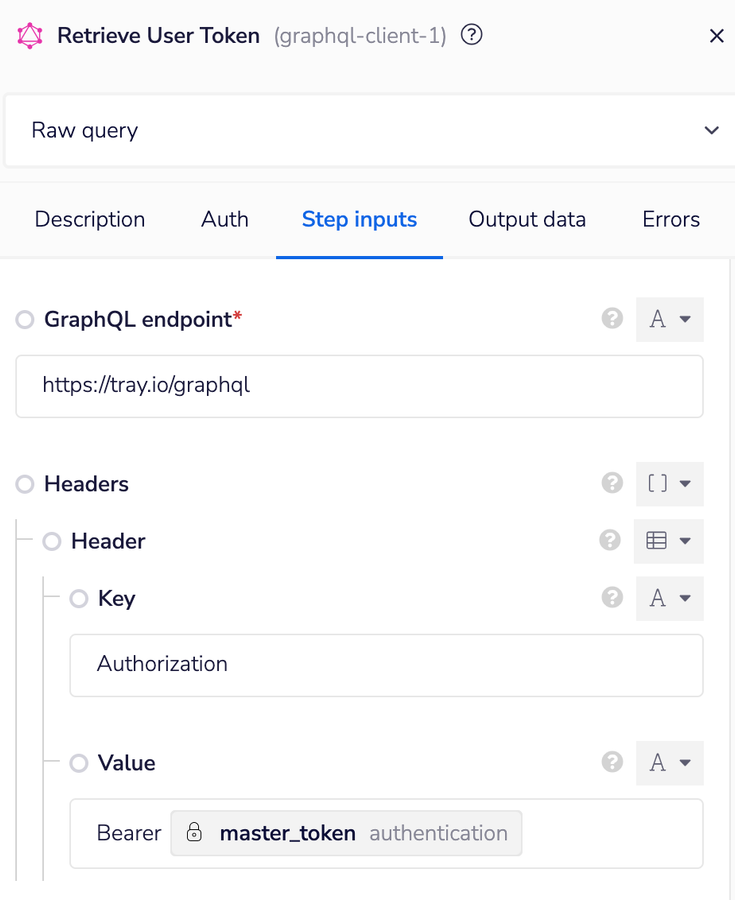 The last step of this workflow will require you to insert the GraphQL Client connector again. Since you will not be using the master token from your Tray Embedded API authentication you made earlier, there is no need to attach the authentication to this step. Instead, you will use the access token generated from the previous GraphQL Client connector for authorizing access in the Header.