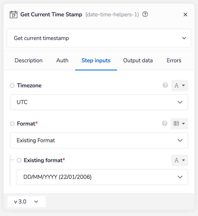 Now you will insert the Date Time Helpers connector using the Get current time stamp operation to retrieve the current execution time stamp in whatever date time format you wish to use.