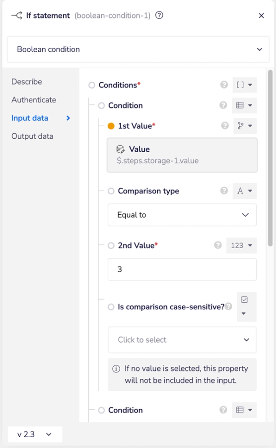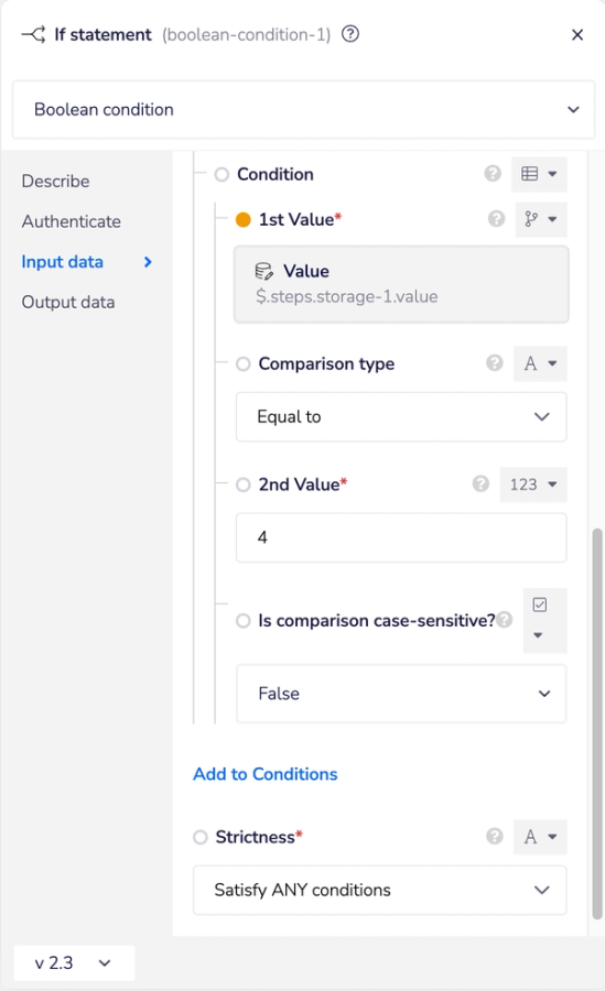 by default. This variable that is used in the if statement can come from any service. For the sake of the example, we created it in a Data Storage connector step.