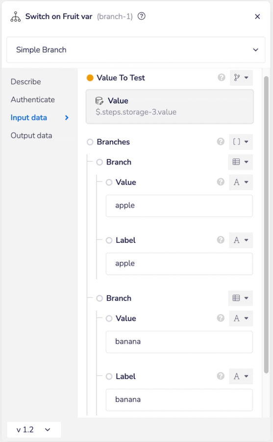 In the subsequent step, we will use the Branch connector to simulate a switch statement. Inside the Branch connector, you can specify the value to perform the switch statement on. In our case, the switch statement will be performed on the fruit