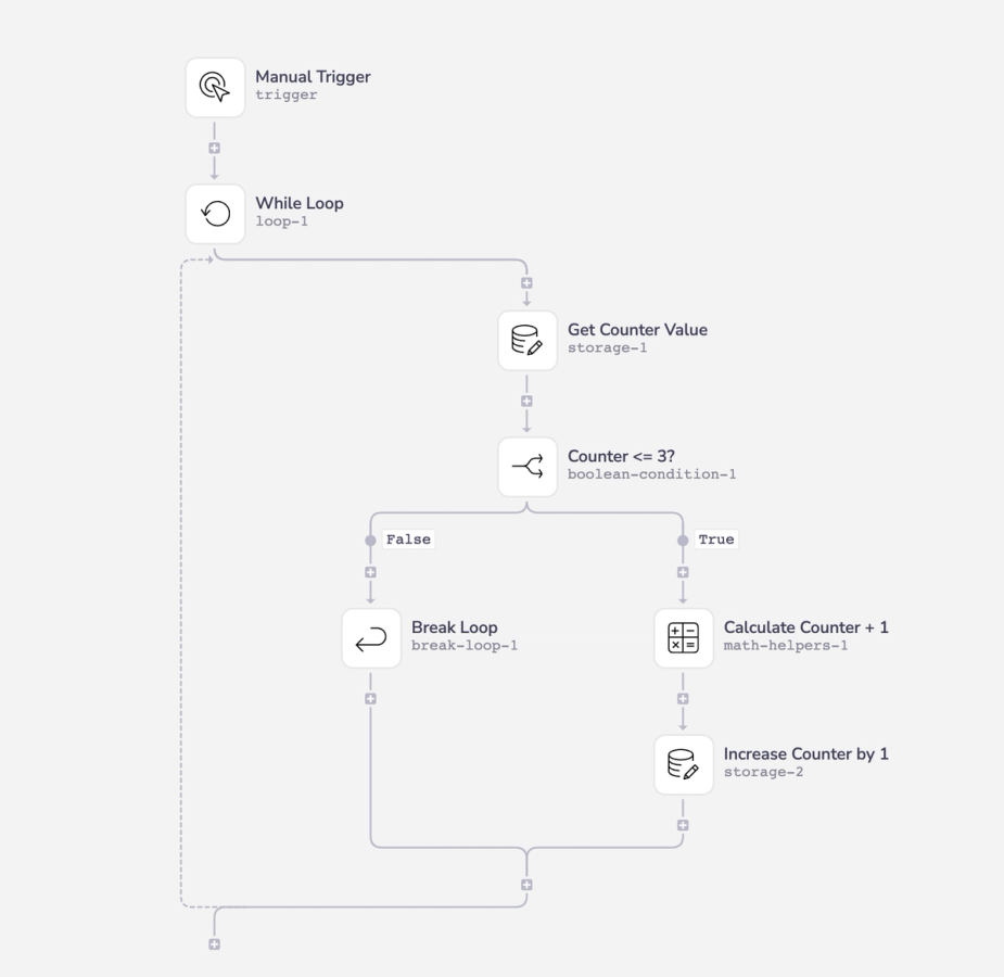 We will use the Loop connector again to simulate a while loop. This time, however, we will use the Loop Forever operation. Within the while loop, we will perform an if statement to check whether or not the counter