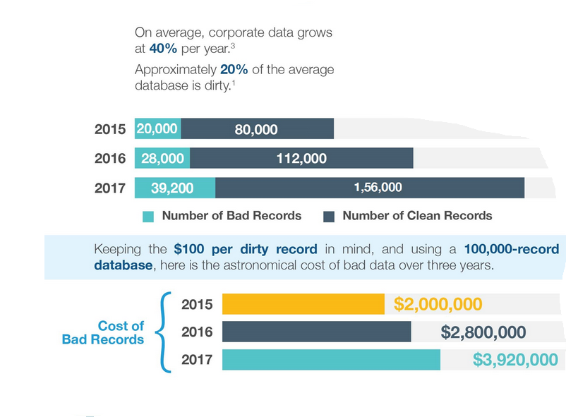 Bad CRM data can have a severe impact on sales productivity, as your reps can’t contact leads with no contact information. Or, your reps will waste time hunting down accurate contact information. Bad data also causes inaccurate reporting and analytics, hurting your ability to accurately forecast and budget every quarter. Poor data hygiene costs the US economy an estimated $3 trillion each year.