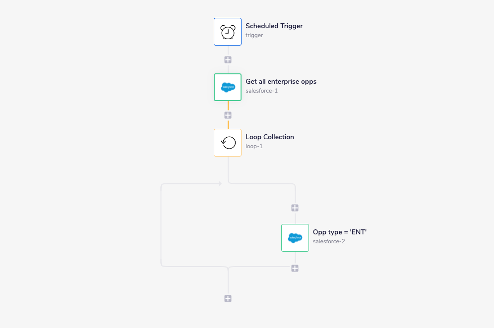 In this example, we use a scheduled trigger to kick off our workflow at a predetermined interval — in this case, every other week. Then, we pull all opportunities labeled as ‘enterprise’ from Salesforce. Next, we use a loop helper, to separate each record and change the opportunity type to ‘ENT.’ The loop helper will end once we’ve edited all enterprise opportunities. Now, you won’t have to manually edit opportunity fields every other week, and can instead focus on more strategic data hygiene projects. For more ideas, check out our post on data hygiene automation.