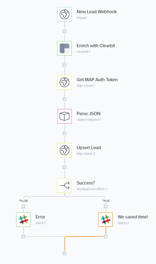 The marketing team at lead sales intelligence platform felt the pain of bringing in lots of fantastic leads through its marketing automation solution (Marketo, in this case), only to have them go cold as it waited to get them imported properly into its CRM (Salesforce, in this case) and its own sales intelligence tool. To cut down on the delays and serve up leads to its sales teams while they were still piping hot, the team chose to use Tray to integrate its sales enrichment solution (Clearbit, in this case) to Marketo and its internal communications tool (Slack, in this case). Here’s exactly what they did: