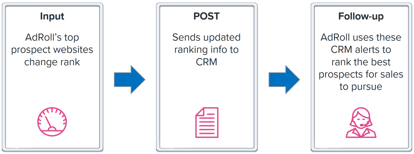 One class of use cases for webhooks in operations or revenue fields is using them to trigger automatic alerts whenever anything changes in your internal CRM. Leading advertising and retargeting network AdRoll used webhooks in exactly this way to rank sales opportunities and ultimately surface hot leads most likely to close for its sales team.