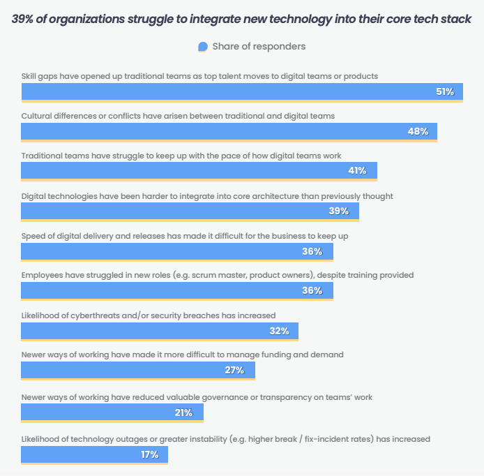 The integration challenge has only become more urgent in recent years. 90% of enterprise leaders are accelerating their digital transformation initiatives–the implementation of digital technology across an organization, especially with regards to migrating from legacy on-premise systems to the cloud.