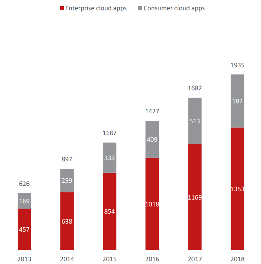 The rising number of SaaS applications at the modern enterprise. Source: McAfee