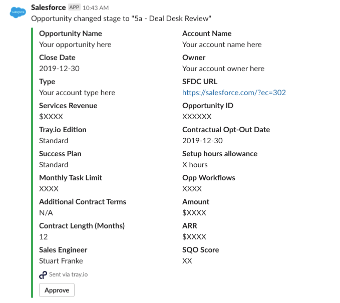 As your organization collaborates on recurring projects, approvals processes can align stakeholders and increase efficiency. For example, a deal desk is an approval process in sales that submits pending deals for executive approval to ensure that all engagements are worthwhile for the business and the prospect. Deal desks yield such significant efficiency gains that they have become standard in more than 70% of modern sales organizations.